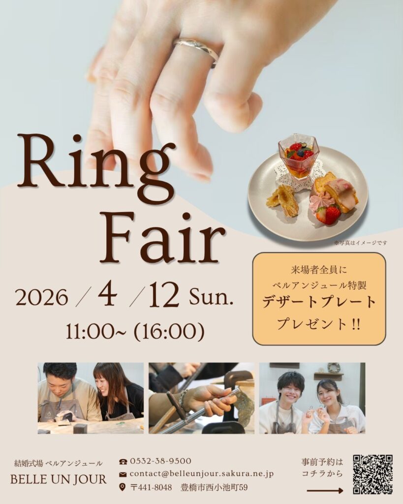 今週日曜日、結婚式場ベルアンジュールにて、ブライダルリングフェアを開催いたします。